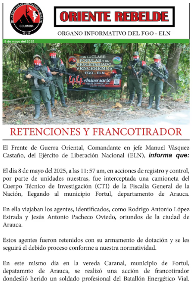 La Gobernación del departamento de Arauca rechazó de manera enérgica el secuestro de los funcionarios del Cuerpo Técnico de Investigación (CTI), Rodrigo Antonio López Estrada y Jesús Antonio Pacheco Oviedo, ocurrido el jueves 8 de mayo en zona rural del municipio de Arauquita. La administración departamental exigió su liberación inmediata y solicitó el respaldo de organismos nacionales e internacionales en la gestión de su regreso seguro.