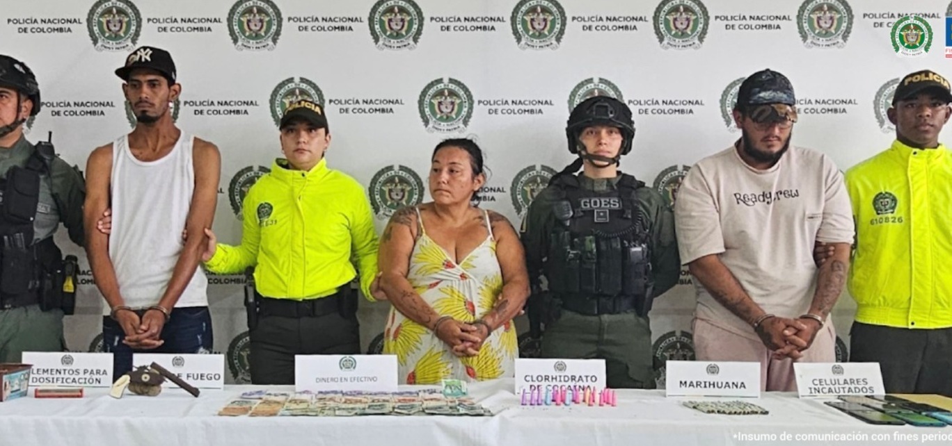 Entre los elementos incautados se encontraron cocaína y sus derivados, marihuana, así como instrumentos para la dosificación de drogas. Los detenidos, que incluyen a una mujer conocida como “La Patrona”, enfrentan cargos por tráfico, fabricación o porte de estupefacientes, además de delitos relacionados con armas de fuego.