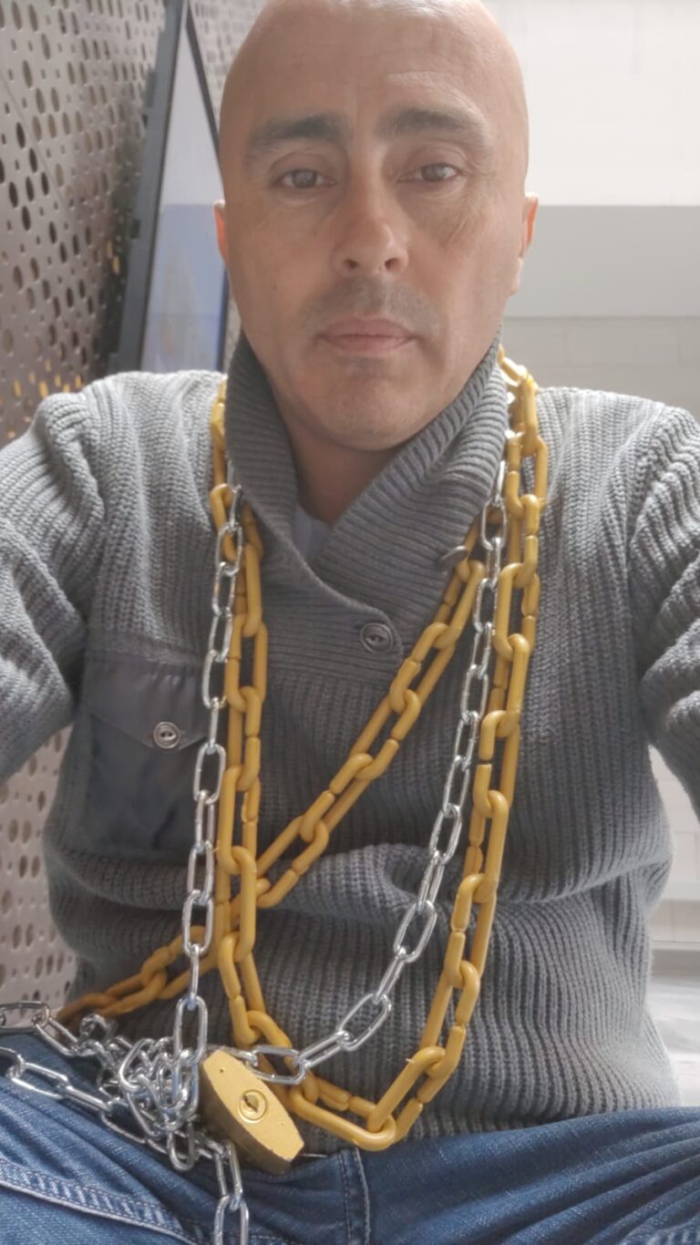 El abogado Lenin Bustos se encadenó frente a las instalaciones de la UNGRD en Bogotá,…