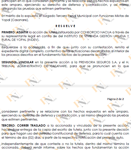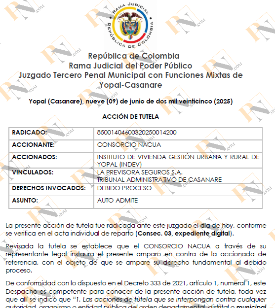 El Consorcio Nacua interpuso una acción de tutela ante el Juzgado Tercero Penal Municipal con Funciones Mixtas de Yopal, alegando la vulneración de su derecho al debido proceso por parte del INDEV.