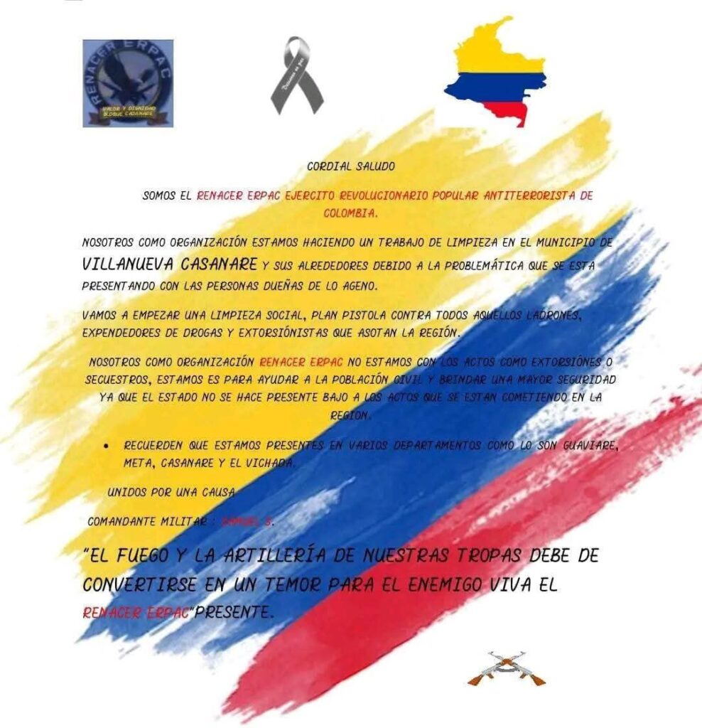 Un fantasma del pasado parece estar reapareciendo en Casanare. Bajo el nombre “Renacer ERPAC”, un grupo emergente ha comenzado a difundir amenazas y reivindicar ataques sicariales en Villanueva y otras zonas del departamento.