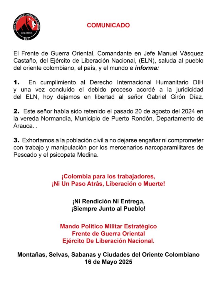 El 16 de mayo, el ELN emitió un nuevo comunicado anunciando la liberación de Gabriel Girón Díaz, alias “Mogotes”, quien había sido capturado el 20 de agosto de 2024 en la vereda Normandía, municipio de Puerto Rondón (Arauca). Según la guerrilla, la decisión se tomó en cumplimiento del Derecho Internacional Humanitario (DIH) y tras un “debido proceso” según sus normas internas.