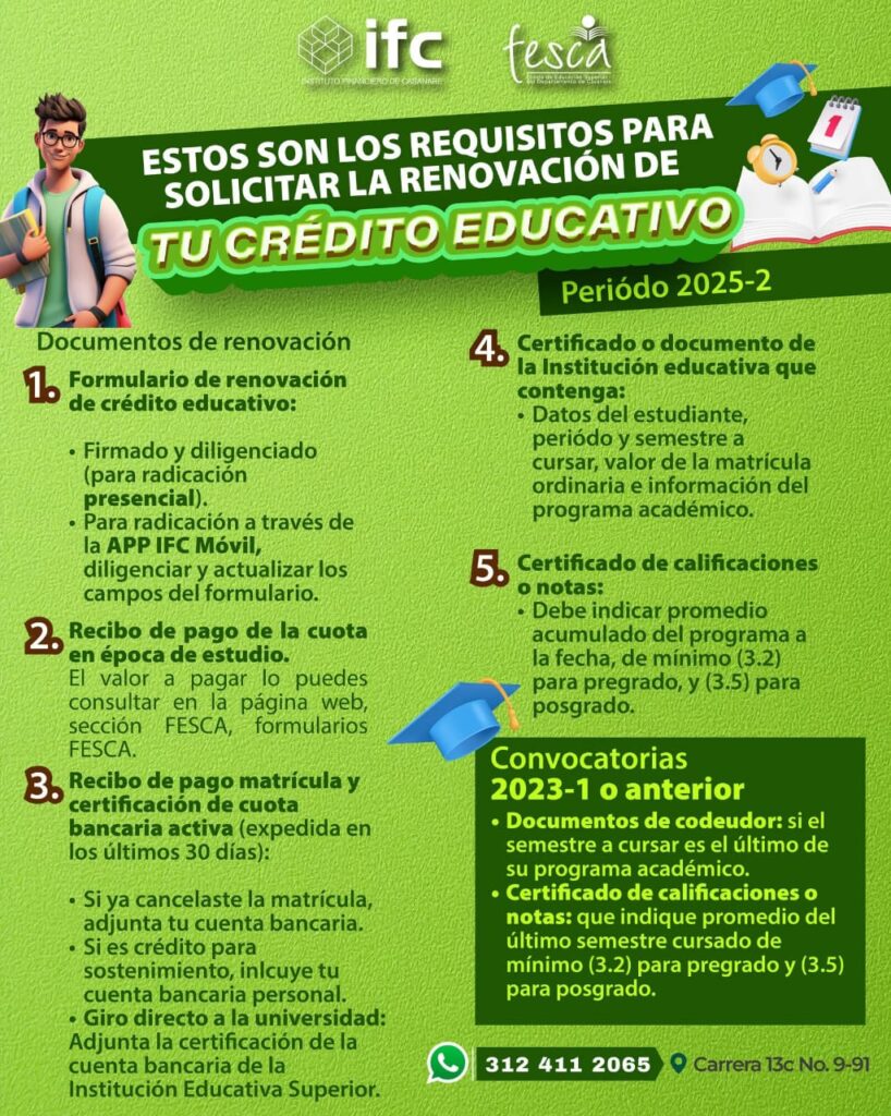 El IFC recordó a los beneficiarios del crédito educativo FESCA que tienen hasta el 30 de septiembre para renovar su financiamiento correspondiente al segundo semestre de 2025. El trámite, que puede realizarse de manera presencial o digital, busca agilizar el acceso a los recursos para la comunidad estudiantil.