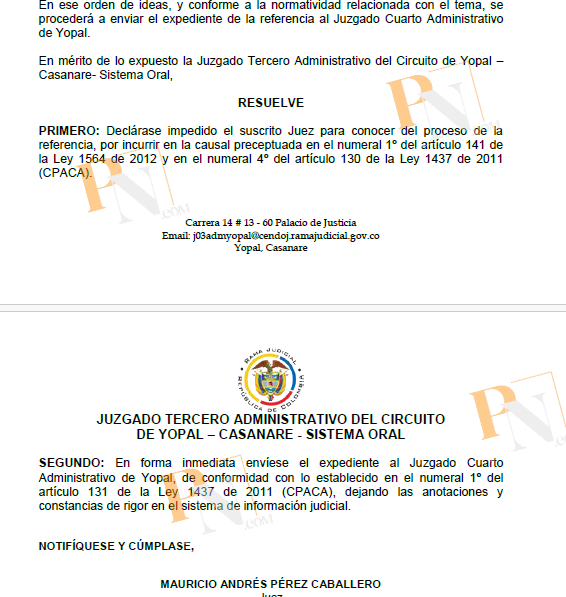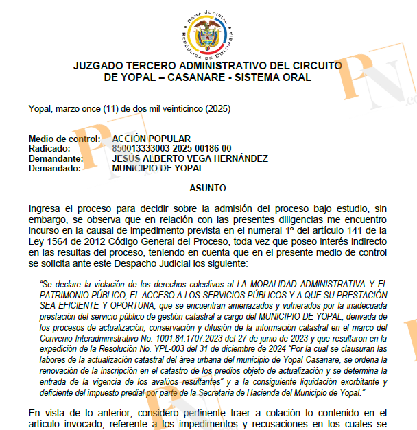 El Juzgado Tercero Administrativo de Yopal decidió apartarse del proceso relacionado con la acción popular interpuesta contra la actualización catastral del municipio, argumentando que el juez titular, Mauricio Andrés Pérez Caballero, tiene un interés indirecto en la resolución del caso.