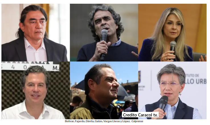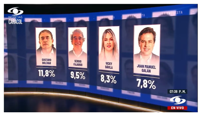 En un primer escenario con 27 precandidatos presidenciales, Gustavo Bolívar lideró la intención de voto con un 11.8%. Le siguieron Sergio Fajardo con un 9.5%, Vicky Dávila con un 8.3%, Juan Manuel Galán con un 7.8% y Germán Vargas Lleras con un 7.3%. Claudia López registró una intención de voto del 6.8%.