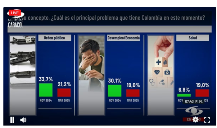 La reciente encuesta de Invamer para Blu Radio y Noticias Caracol, realizada entre el 21 y el 25 de marzo de 2025, no solo midió la intención de voto para las elecciones presidenciales de 2026, sino que también indagó sobre los principales problemas que preocupan a los colombianos. Ante la pregunta sobre el principal problema que tiene Colombia en este momento, el “orden público” fue la respuesta más frecuente, alcanzando un 21.2% de las menciones.
