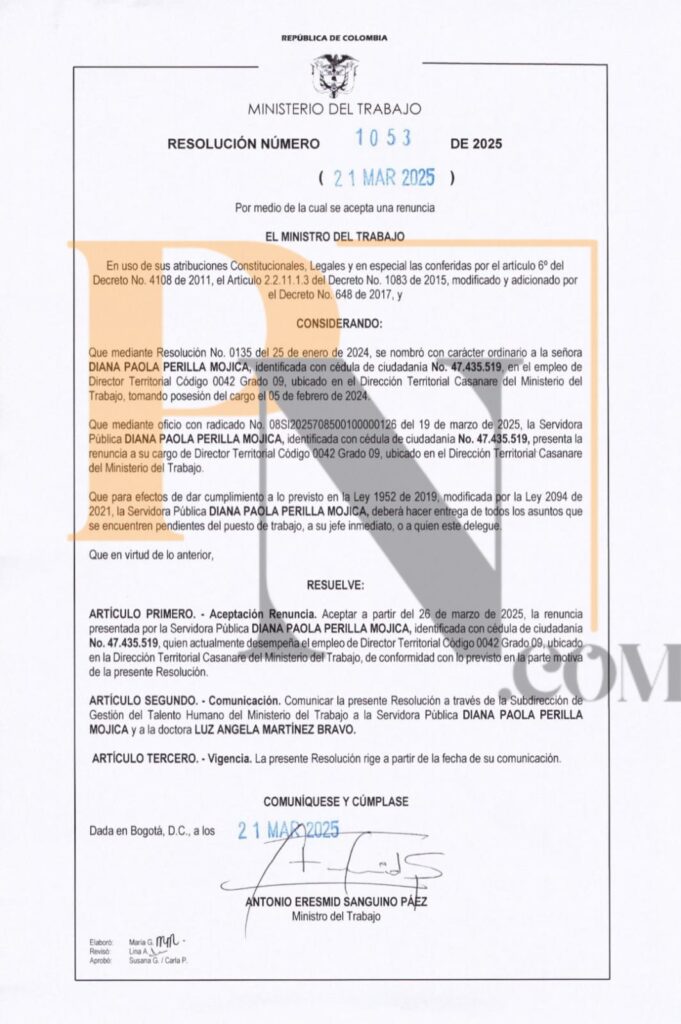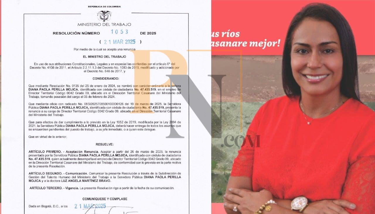 El presunto caso de corrupción que involucró la supuesta expedición irregular de un certificado a favor de ERCONS Ingeniería & Arquitectura S.A.S. por parte de Diana Paola Perilla Mojica, Directora Territorial de Casanare del Ministerio de Trabajo, habría tenido consecuencias para la funcionaria.