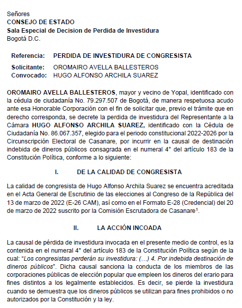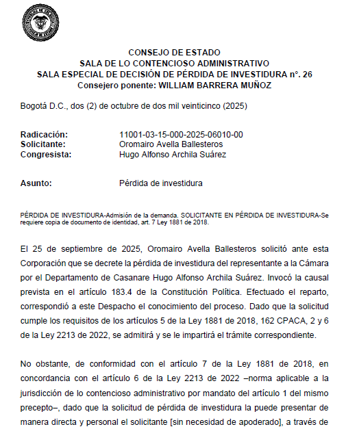 El Representante a la Cámara por Casanare, Hugo Archila Suárez, se refirió públicamente a la demanda por pérdida de investidura que fue admitida en su contra.