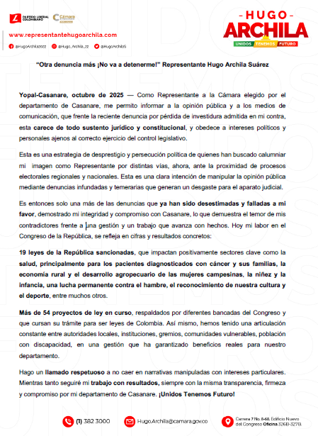 Frente a la sombra de la denuncia, el Representante Hugo Archila optó por defender su trayectoria con cifras. En su defensa, enumeró los logros de su gestión en el Congreso de la República. Destacó la sanción de 19 leyes de la República que, según su visión, impactan positivamente sectores sensibles para la ciudadanía.