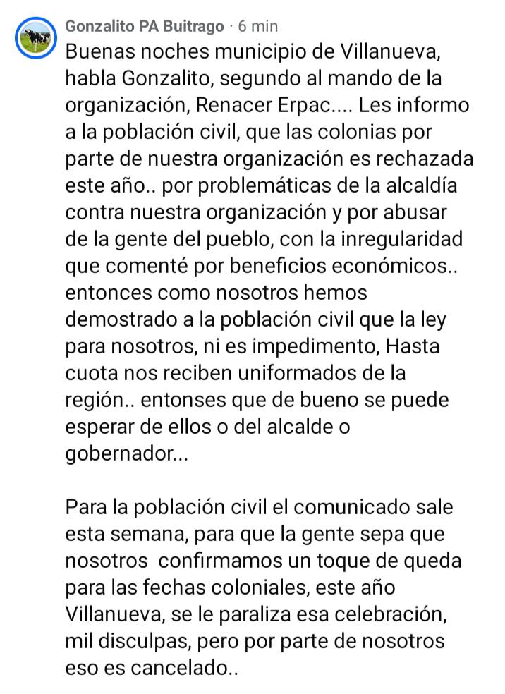 Villanueva de nuevo amenazada por grupo armado ilegal.