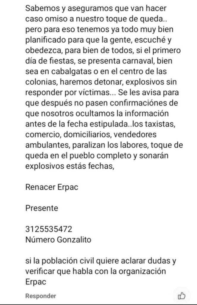 Las autoridades no han emitido ningún comunicado sobre el panfleto, lo que aumenta la desesperación. Mientras tanto, los rumores crecen y el temor se expande como un virus. La pregunta que todos se hacen es, que nivel de credibilidad tienen estas amenazas, cuando se aproximan las tradicionales fiestas de las Colonias en este municipio del sur de Casanare.